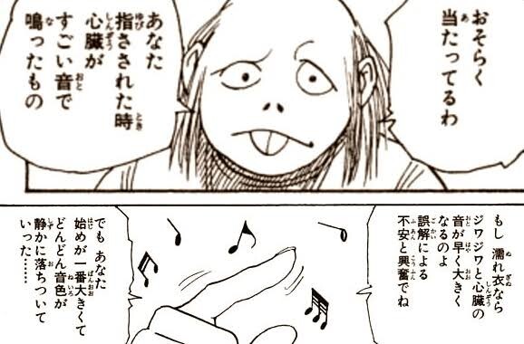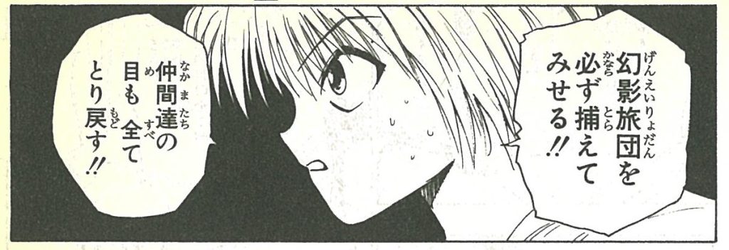 クラピカはレオリオに動機を聞いた時、「本当の目的は金ではない」という返答を期待していたはずだ。しかし、レオリオが口にしたのは金でしかなかった。レオリオは本当に金だけが欲しくてハンターになろうとしていたのだ。金儲けだけが生きがいの人間を嫌うクラピカにとって、それは納得がいく答えだったのだろうか?レオリオの自己開示を受け、クラピカは何を思い、何を感じたのか。それを知るヒントは、小さい一コマに描かれたクラピカの表情にある。その内心を正確に表現するには、僕の文章力では手に余る。