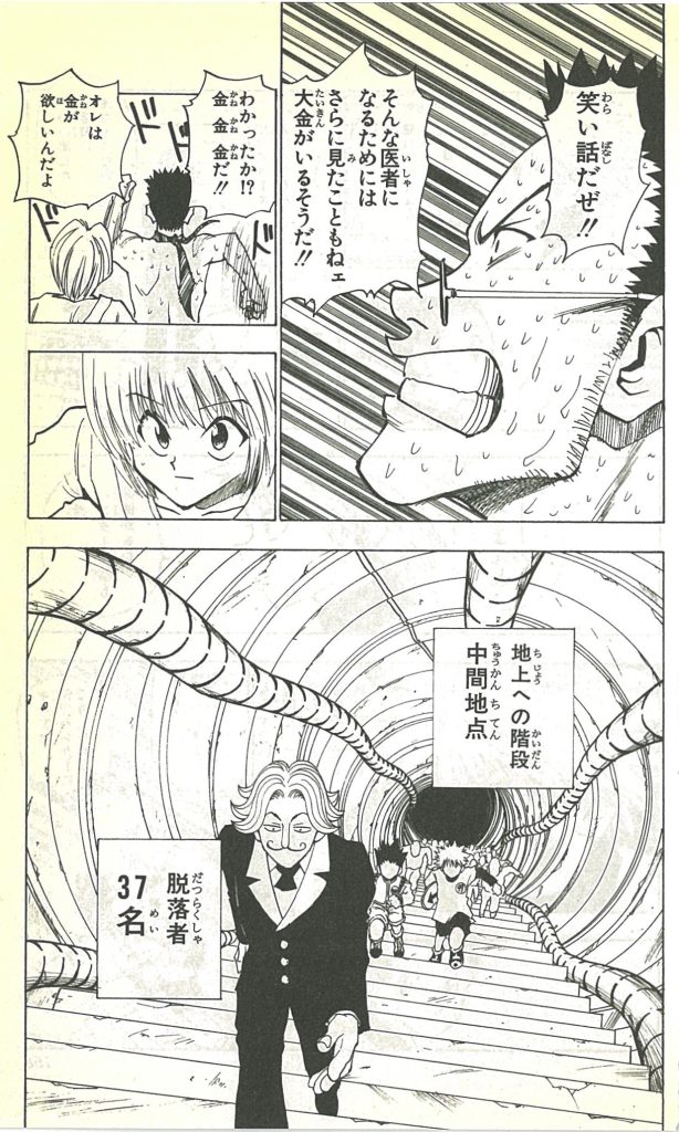 さて、いくつかレオリオのパーソナリティの特徴を挙げたが、実はいずれもこのキャラクターを語る上での重要な部分だと僕は考えていない。これらは枝葉でしかなく、核となるのは冒頭でも少し触れた、ハンター試験に臨む動機付けの部分である。