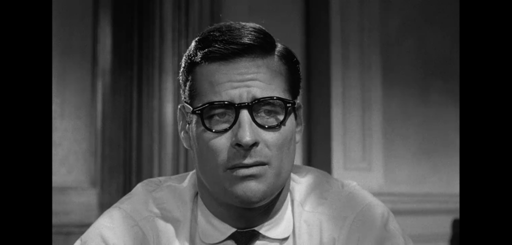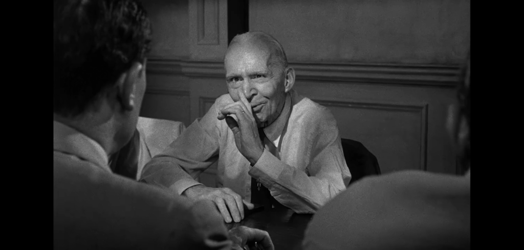 8番の隣に座った9番を見てみましょう。おそらく十二人の中で最も高齢の人物です。議論の途中8番の提案で自身を除く11人で投票し、11票すべてが有罪であれば8番も有罪に転向、しかし無罪が1票でもあれば議論は続ける、というルールで投票が実行されます。「guilty…guilty…guilty…」と有罪票が開票され続ける中、「…not guilty」と一枚だけ無罪票が在りました。それを投票したのがこの9番です。一番早く無罪側に転向しました。