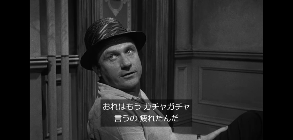 10「わかっておらんな。細かいことなんか何の意味もない。みんなもあの少年を見たろう。あのナイフや映画の作り話を信じるのか。連中は生まれつきウソつきだ。第一真実とは何か知らんのだ。しかも連中は殺人に理由などいらんのだ。おまけに大酒飲みでいつも酔っててな、ドブで死んでるんだ。それでも誰も気にしちゃいない。凶暴だ。どこへ行く。殺しなんか平気だ。いつもケンカばかりだ。人が殺されても気にせん。そりゃいい連中もいる、それは認める。でもまともな連中は例外だ。大部分は無能な奴らさ。どうした?みんな大きな間違いを犯してる。あのガキは嘘つきだ。…聞いてくれ、連中は悪いやつらだ。…どうした、俺が話してるのに。聞けよ。ああいうガキの事をあんたたち知らんのだ。実に危険なんだよ。あの連中はね。いいかい、つまり…頼む、聞いてくれ」